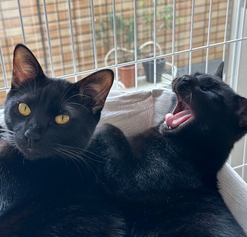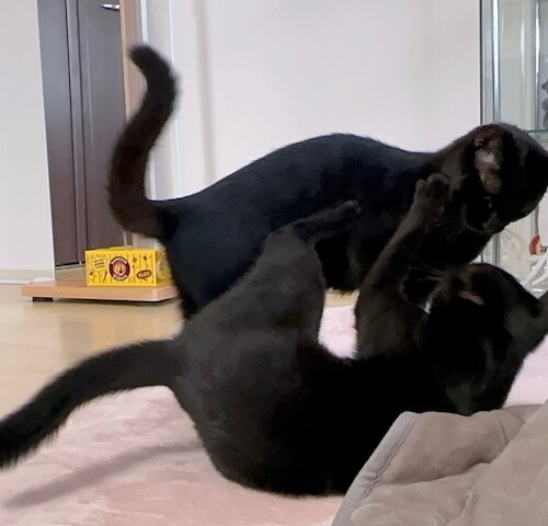 あるあるですが、ぺろぺろと 仲良くしてるかと思ったら 取っ組み合いが始まるんですよね… 仲良くペロペロしてたのに、なぜ戦になるのか?#黒...