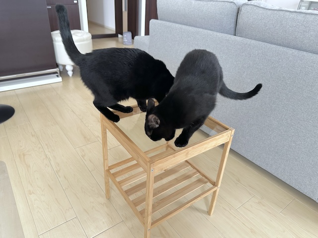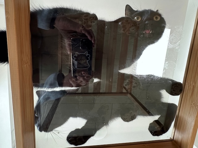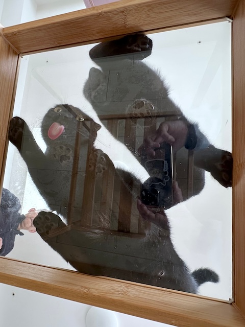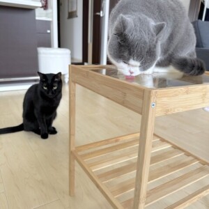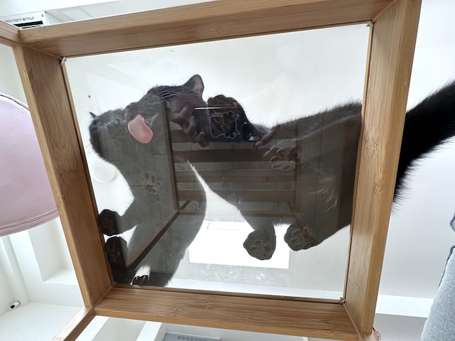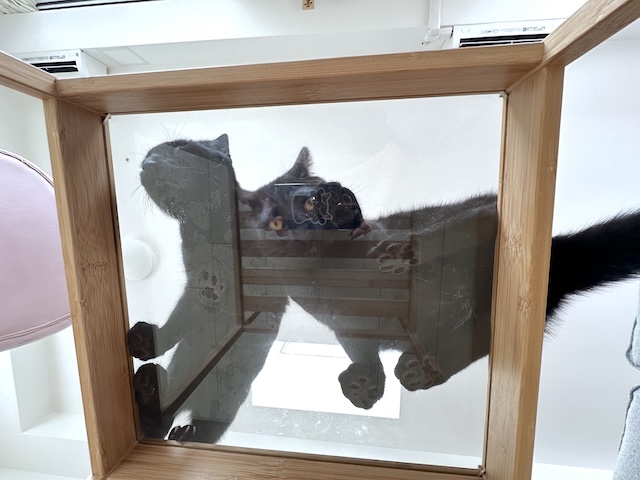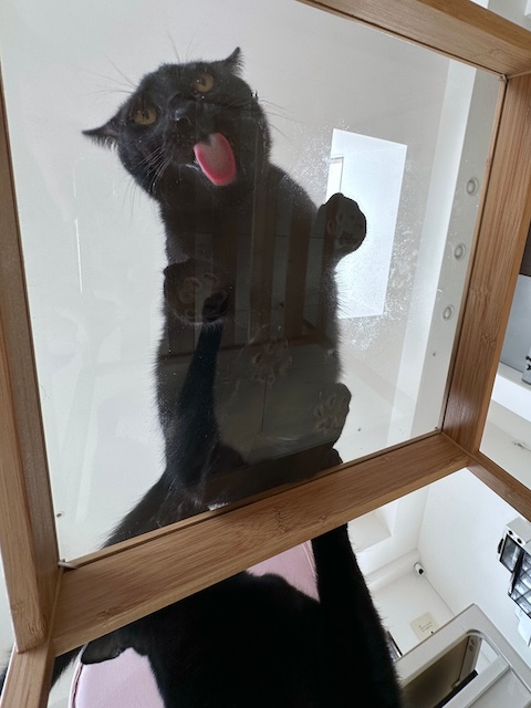 今回も、またたびふりかけたので、ガラスが濡れてます