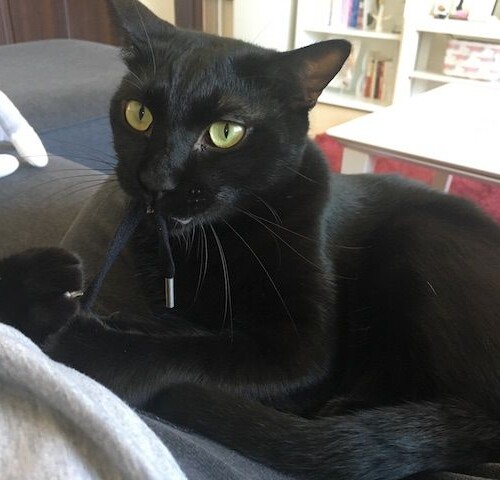 母の膝に乗って来られたヤマトさん。 早速、スウェットのヒモをご堪能されてました(^^;; ヤマト「オレ様にょ前に、いい物あるじゃにゃいか...