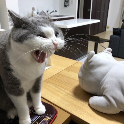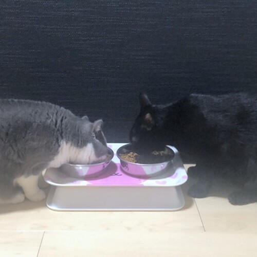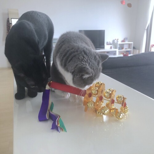 お父さんに遊んでもらった後は、 カツオを必死で召し上がってます♡ 梅子「捕まえてやるにゃ!」 ヤマト「ねーちゃん、頑張れに...