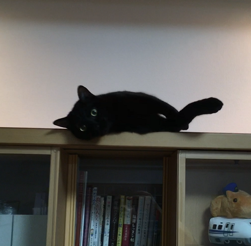 本棚の上で、甘えるヤマトさん(笑) 父でないと、届きません(^^; ※ヤマトさんの肉声入り ヤマト「父ちゃん...