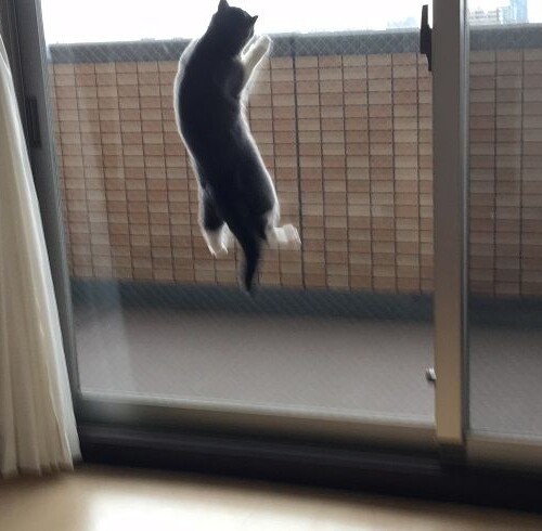 ある日、虫が窓についてたときのこと、、、 虫にジャンプなさる梅子さん。 梅子さんの様子を見て、同じくジャンプ...
