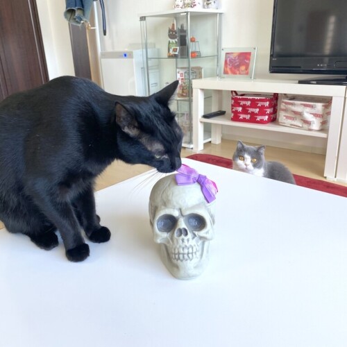 母がダイソーで 衝動買いしたガイコツさん。 すでに調査しまくって冷静な梅子さんと 激しく調査なさるヤマトさんです。 梅子「また母ちゃん、...