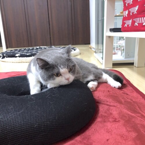 ドーナツ型クッションの上で くつろいでおられることが多い梅子さん。 この時は、ちと違う感じでした。。。 母「浮輪で浮いておられるのですか...